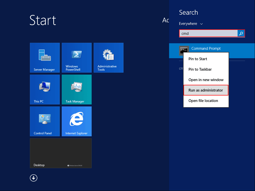 Başlat sekmesinden “Cmd” yazarak komut satırı arayüzünü “Run as administrator” (Yönetici olarak çalıştır) seçeneği ile çalıştırıyoruz.
