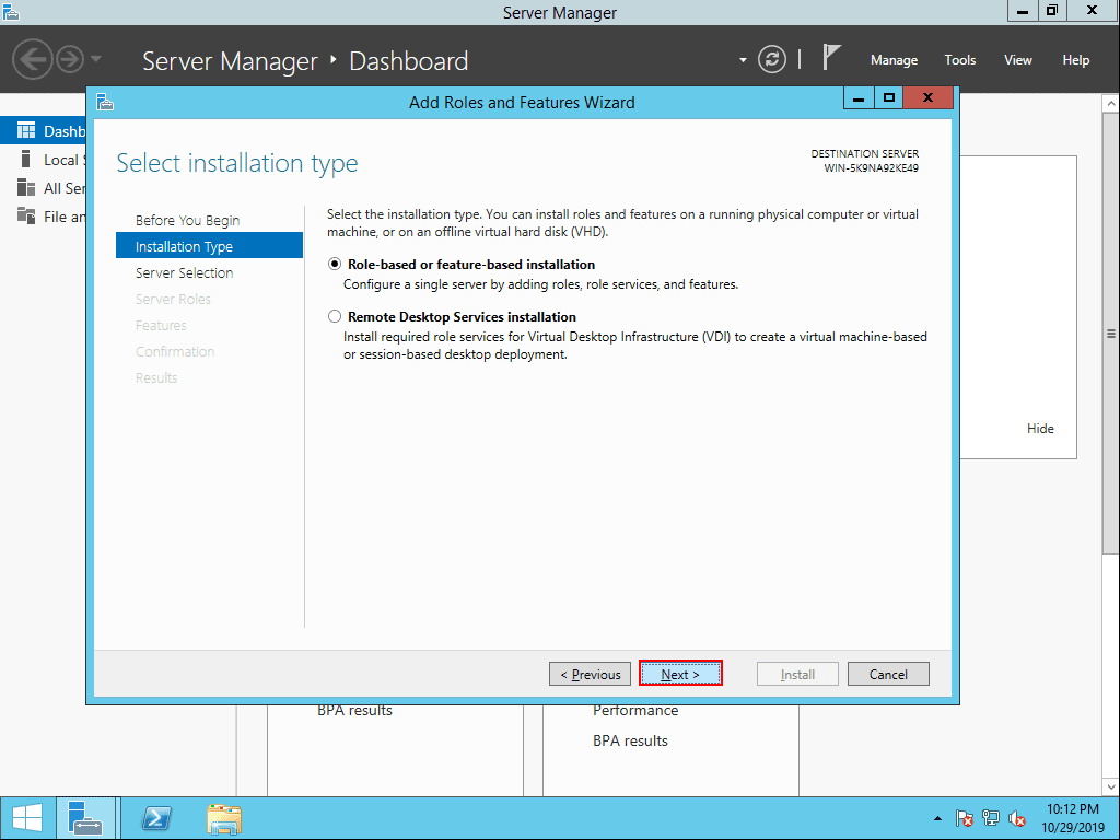 İkinci adım, kurulumun türünün ne olacağıdır. Biz bir özellik kuracağımız için “Role-based or feature-based installation” seçeneğini seçiyoruz. Ardından “Next” butonu ile sonra ki adıma geçiyoruz.