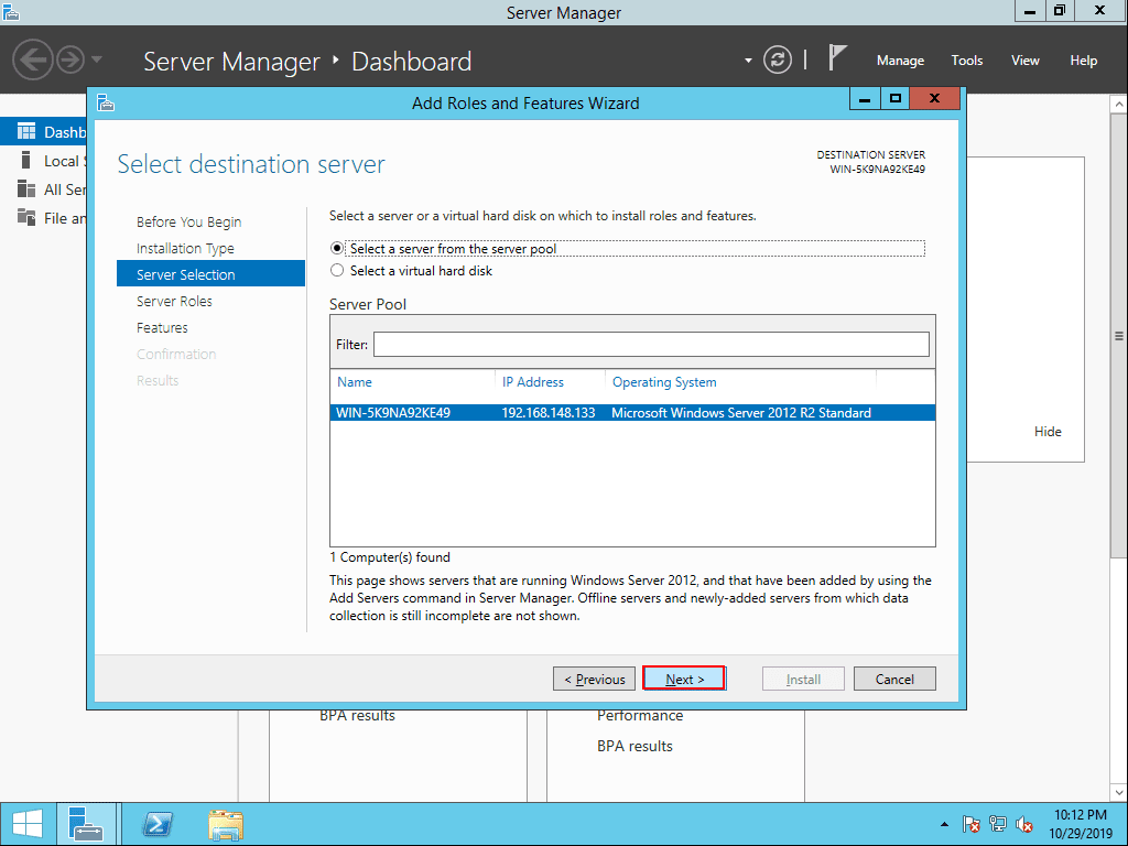 Bu adımda birden fazla sunucumuz bulunuyorsa, hangi sunucuya kurulumu gerçekleştireceğimizi seçiyoruz. Bu örneğimizde bir adet olduğundan sonra ki adıma geçiyoruz.