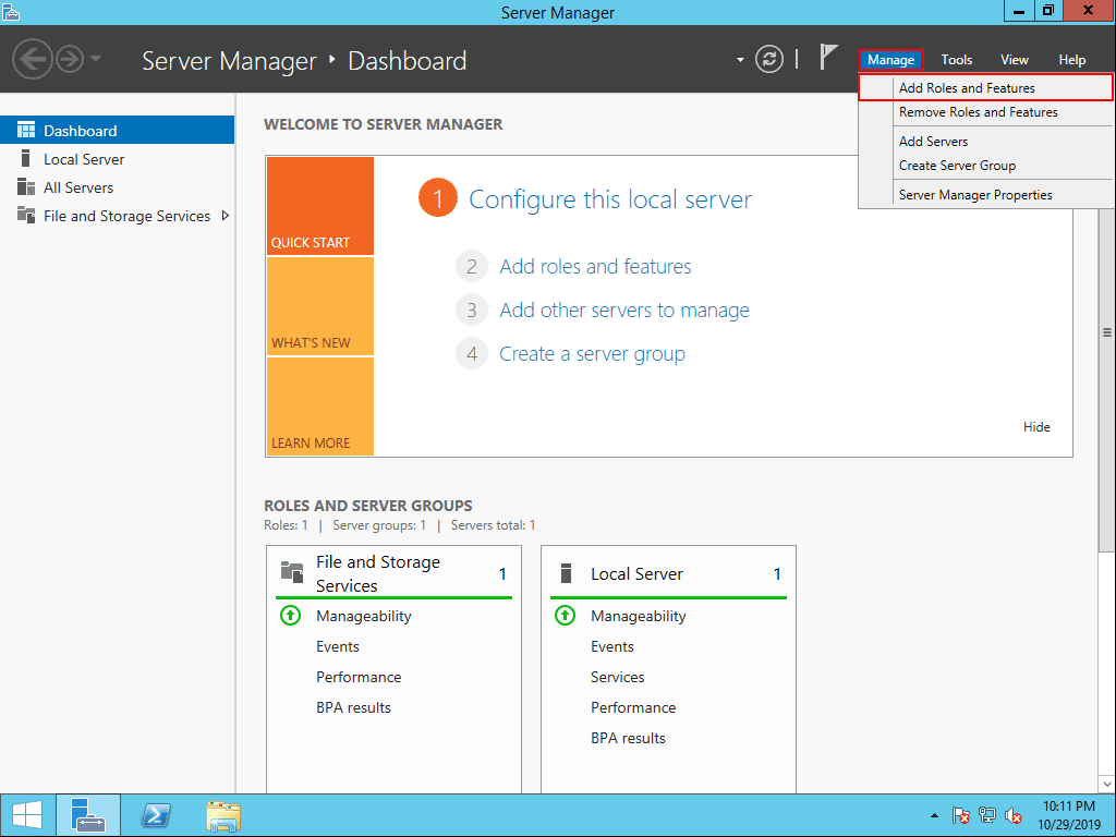 Bunun için “Server Manager” penceresinden “Manage” sekmesi altında “Add Roles and Features” seçeneğini seçmeniz.